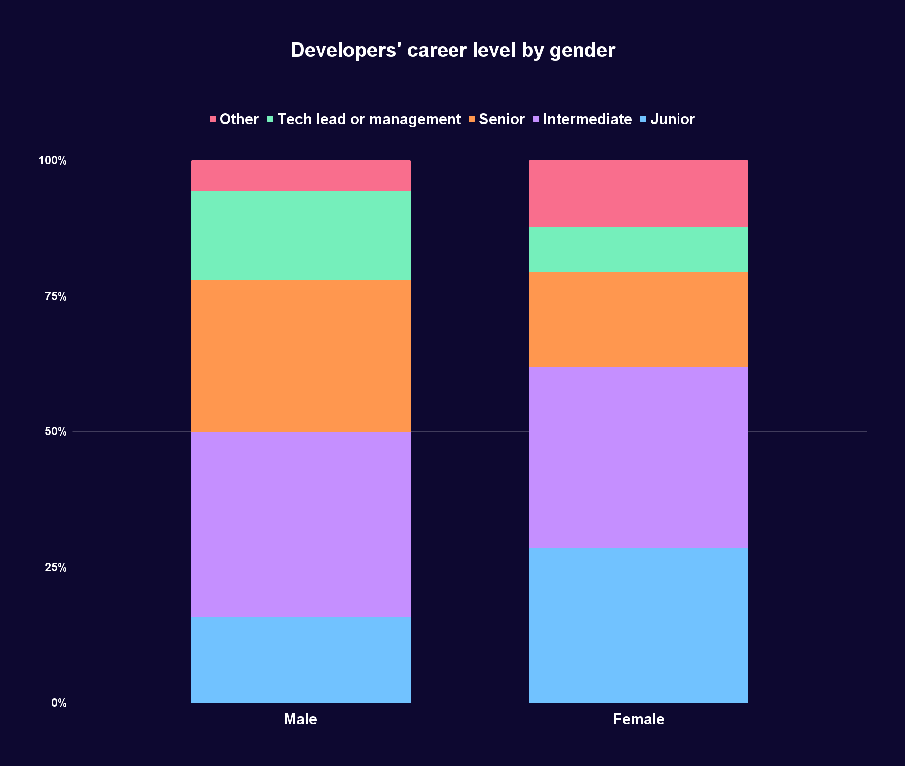 Juniors are also more representative when it comes to gender. Women developers typically skew junior and there are significantly fewer women at the senior and tech lead levels.