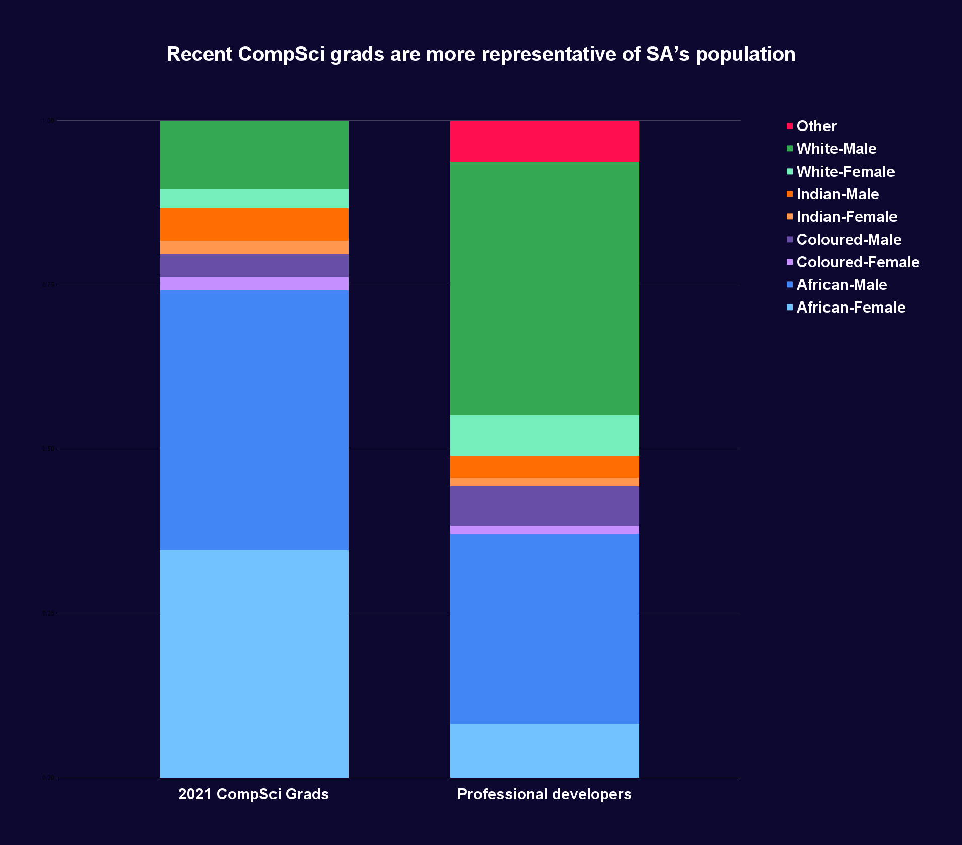 Recent computer science graduates are far more representative of South Africa’s population than professional developers overall. Over time, professional developers will reflect these graduates, and diverse teams will become the norm, but until then: The graduate pool is key to greater team diversity.