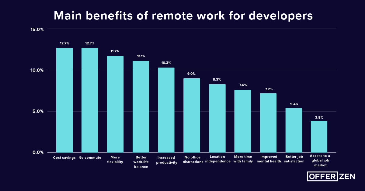 Not having a commute to the office and cost savings are tied as the top benefits for developers, giving them better work-life balance and increased productivity.