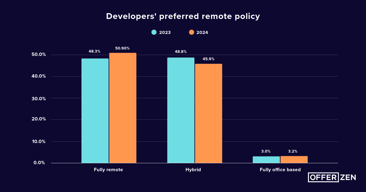 The majority of developers aren’t too keen on this trend and their preference for remote work has grown over the years. As a result, remote has overtaken hybrid as the most desired work policy.