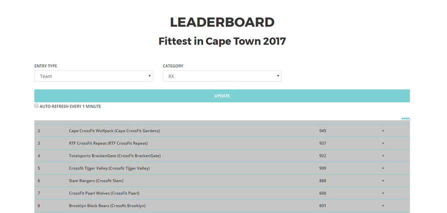 The next gig came two months later: An event that stretched over three separate dates - a qualifier event in Jozi, an online qualifier competition and the main contest in Cape Town. My first priority was implementing a payment gateway. The event organisers handled the leaderboards in Jozi themselves while I worked on the online competition functionality. This allowed athletes to record their workout and submit their scores online. Since they could now compete from anywhere, a lot more athletes started signing up once the event went live.