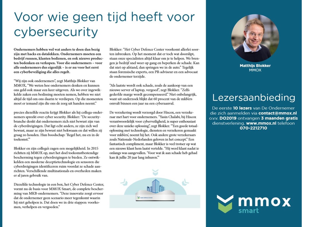 MMOX Smart effectively reduces your companies cyber risks. You outsource your cyber risk management to us. You get insight, targeted advice, incident response, a cyber insurance and software.