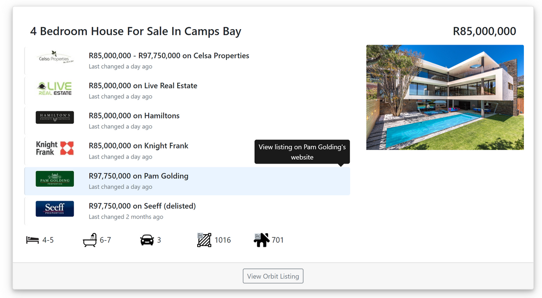 Orbit is an early stage startup in the real estate industry and the next leader in real estate market intelligence. Our goal is to create transparency in the industry with a platform built on data and statistical analytics. In South Africa and many other key markets, there are no centralised sources of information, which makes it challenging to keep track of all moving parts, efficiently monitor real estate portfolios and competitors, and to determine trends to a high degree of precision. Properties are listed across platforms and websites, with varying prices and inconsistent details, making changes in the market slower and less accurately identifiable.
