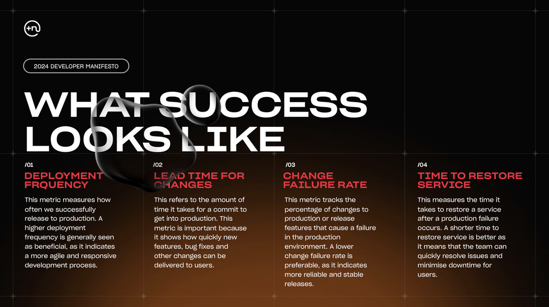 Excellence in software development is the biggest competitive advantage a business can have. Engineering teams must ensure high quality and deliver efficiently. Our robust engineering metrics program is the first step in meeting this dual mandate. Our processes (not our people) are constantly reviewed and refined against DORA metrics.