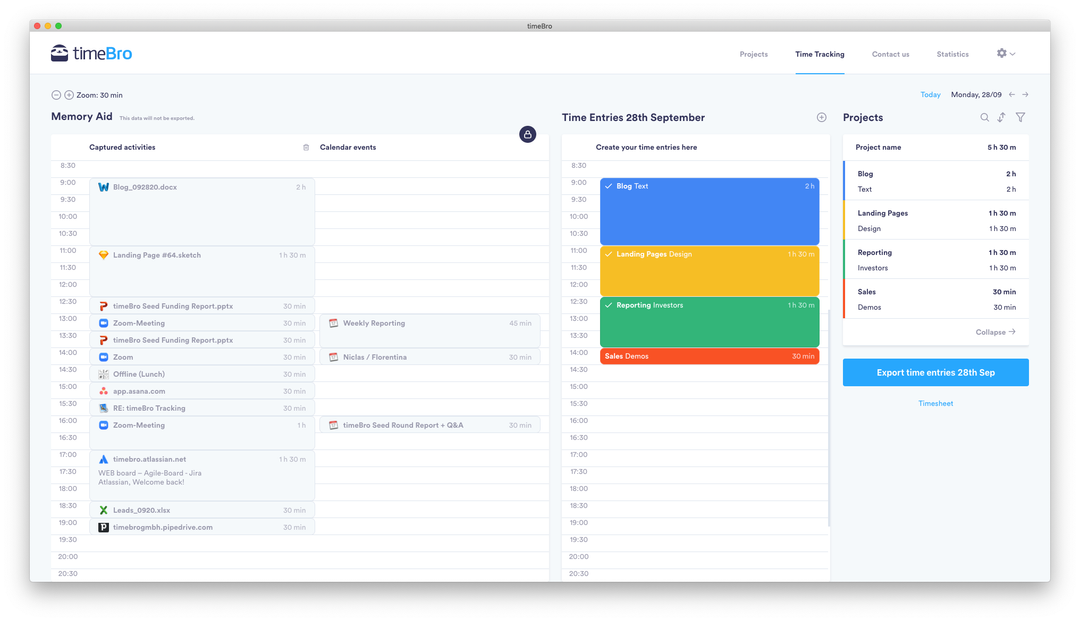 We want to relieve people from the hassle of time tracking: timeBro is a software that automatically records time in all programs and displays your working day - to help you remember every minute immediately and save 75% of your time tracking effort. What makes us uniquely employee-friendly: timeBro stores all data exclusively on the user's device. This means employee monitoring is prevented upfront because no one but the user can access data.